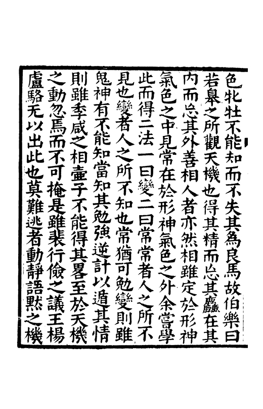 色牝牡不能知而不失其為良馬故伯樂曰若皋之所觀天機也得其精而㤀其麤在其內而㤀其外善相人者亦然相雖定於形神氣色之中見常在於形神氣色之外余嘗學此而得二法一曰變二曰常常者人之所不見也變者人之所不知也常猶可勉變則雖鬼神有不能知當知其勉強逆計以遁其情則雖季咸之相壺子不能得其畧至於天機之動忽焉而不可掩是雖裴行儉之議王楊盧駱无以出此也莫難逃者動靜語黙之機