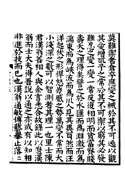 莫難禦者倉卒應變之械於其不可逃以觀其愛憎取予之常於其不可禦以竆其必發難忍之變一變一常反復相明而貧富䝿賤夀夭之理得矣譬之於水匯而為淵激而為湍束而為峽流而為川人見其異耳然而汪洋起伏之形悍怒崩蹙之勢萬變不常而大小淺深之數可以智測者其理一也里士陳君漢翁善相人與余言悉合故錄此以遺漢翁而士大夫得吾說以通之亦或有以知相非進於技而巳也漢翁通敏博藝舉止落(二)