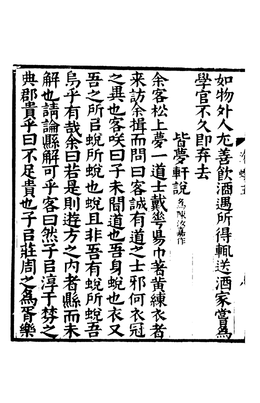 余客松上夢一道士戴𦻏昜巾著黃練衣者來訪余揖而問曰客誠有道之士邪何衣冠之異也客咲曰子未聞道也吾身蜕也衣又吾之所㠯蜕所蜕也蜕且非吾有蜕所蜕吾烏乎有哉余曰若是則逰方之內者縣而未解也請論縣解可乎客曰然子㠯淳于棼之典郡貴乎曰不足貴也子㠯莊周之為胥樂
