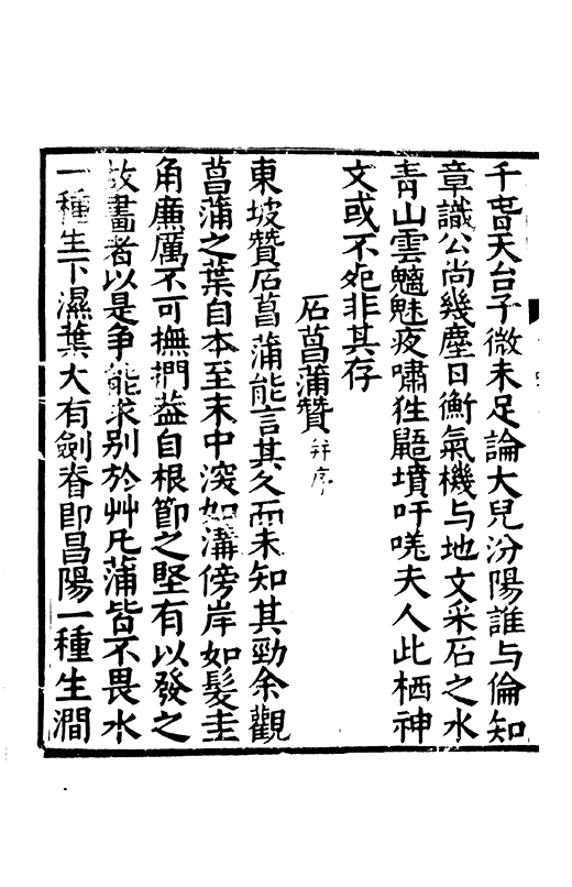東坡贊石菖蒲能言其久而未知其勁余觀菖蒲之葉自本至末中深如溝傍岸如髪圭角亷厲不可撫捫葢自根節之堅有以發之故畵者以是爭能求別於艸凡蒲皆不畏水一種生下濕葉大有劍脊即昌陽一種生澗