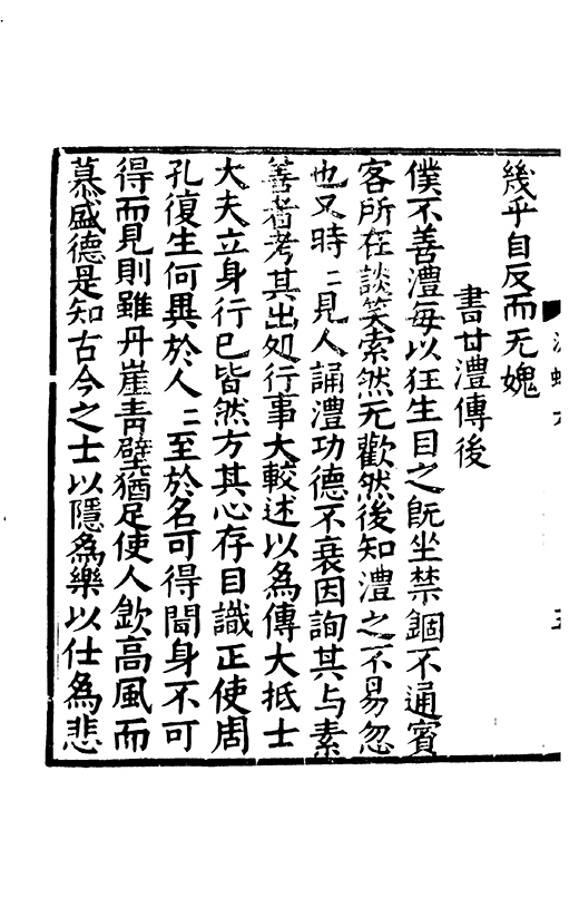僕不善澧毎以狂生目之既坐禁錮不通賓客所在談笑索然无歡然後知澧之不易忽也又時(二)見人誦澧功徳不衰因詢其与素善者考其出処行事大較述以為傳大抵士大夫立身行巳皆然方其心存目識正使周孔復生何異於人(二)至於名可得聞身不可得而見則雖丹崖青壁猶足使人欽髙風而慕盛德是知古今之士以隱為樂以仕為悲