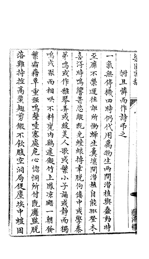 喜淂時鳴響甚恣縱既免螳蜋搏幸脫佝僂中或學秦