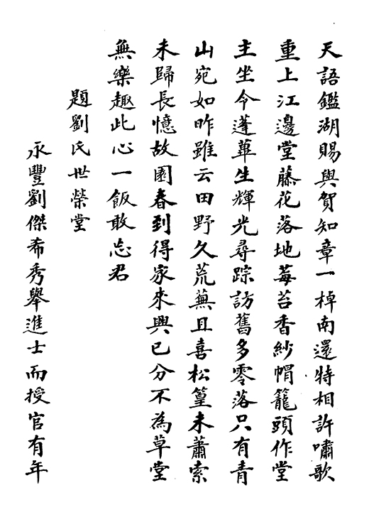 燕子東風柳下門澹雲微雨浥輕塵南山路逺移舟過北斗名高識面新理學忘眠談入夜夀容得酒醉生春重來不用重相約同是斯文即是親