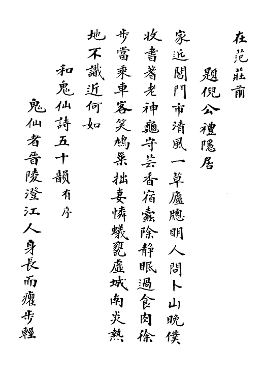 使節遙臨曙色開蒼苔白石路崔嵬藤蘿遶澗峯千尺松竹當牕酒一杯鳥識歌闌隨客散鶴知茶熟伴僧來四郊莫道無荒土還有飢寒遍草萊