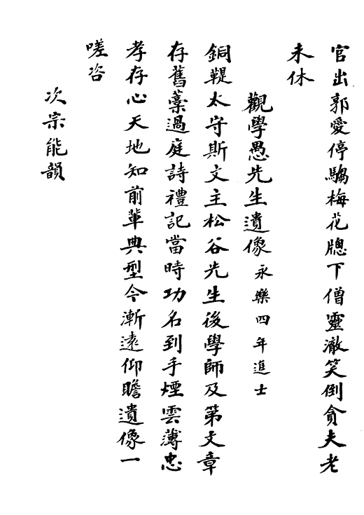 銅鞮太守斯文主松谷先生後學師及第文章存蕭藳過庭詩禮記當時功名到手煙雲薄忠孝存心天地知前史輩典型今漸遠仰瞻遺像一嗟咨