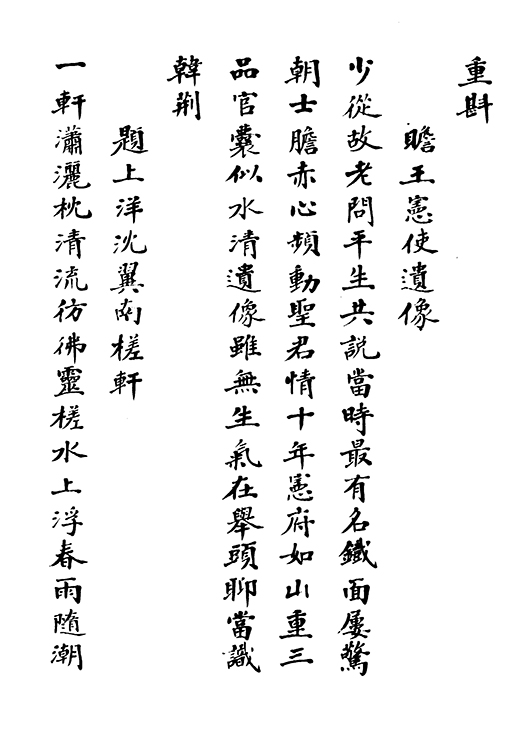 少從故老問平生共説當時最有名鐵面屢驚朝士膽赤心頻動聖君情十年憲府如山重三品官囊似水清遺像雖無生氣在舉頭聊當識韓荆