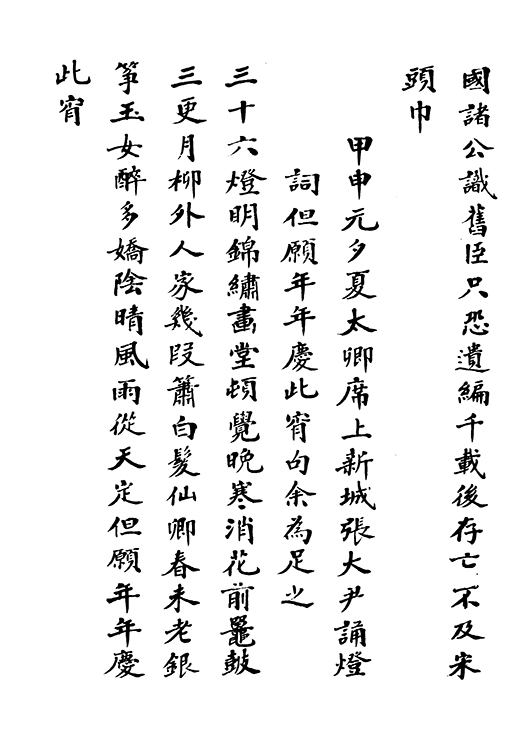 三十六燈明錦繡畫堂頓覺晚寒消花前鼉皷三更月柳外人家幾段簫白髪仙卿春未老銀筝玉女醉多嬌陰晴風雨從天定但願年年慶此宵